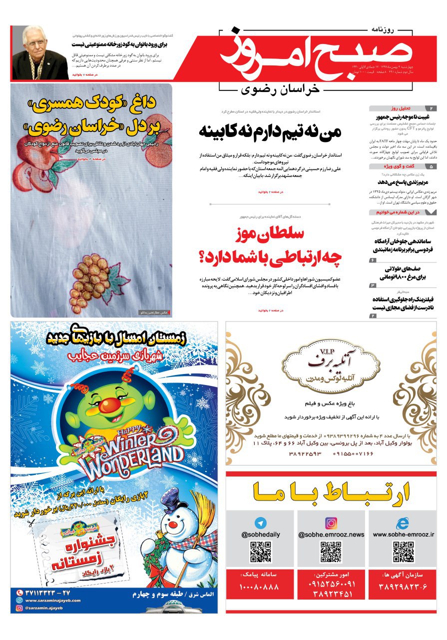 روزنامه چهارشنبه ۳بهمن بهمن 3, 1397/1 دیدگاه/در قاب روزنامه /توسط صبح امروز https://sobhe-emrooz.ir/wp-content/uploads/2019/01/IMG_20190123_090953.jpg 914 1280 صبح امروز https://sobhe-emrooz.ir/wp-content/uploads/2019/07/sobh1.png صبح امروز2019-01-23 09:45:512019-01-23 09:45:51روزنامه چهارشنبه ۳بهمن
